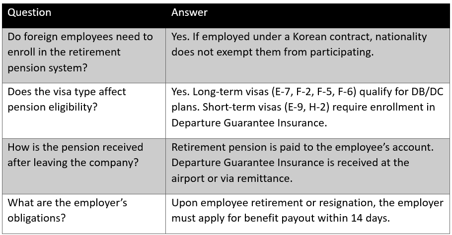 Foreign employers often ask: Does this apply to expatriate staff? Yes—if the employee is under a Korean employment contract, the retirement pension obligation applies regardless of nationality.