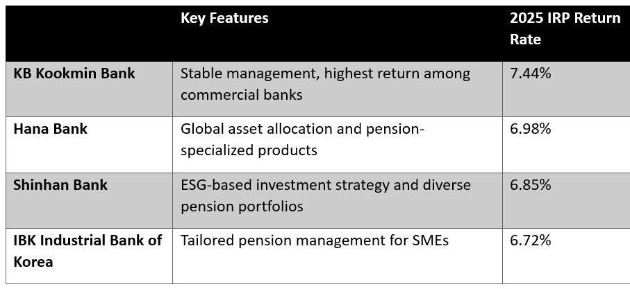 - KB Kookmin Bank, Hana Bank, Shinhan Bank, IBK Industrial Bank of Korea IRP product disclosures (2025)
